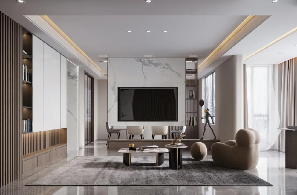 拆除客厅与阳台间移门,引入充沛自然光,打破空间沉闷感,让美好随光影自然流淌。百叶窗下光影交错的地面,成为家庭互动的温馨背景,彰显屋主品味。全屋墙面、顶面采用艺术涂料,弧形边角设计,将温润质感与极简线条完美融合,营造舒适且富有格调的空间氛围。