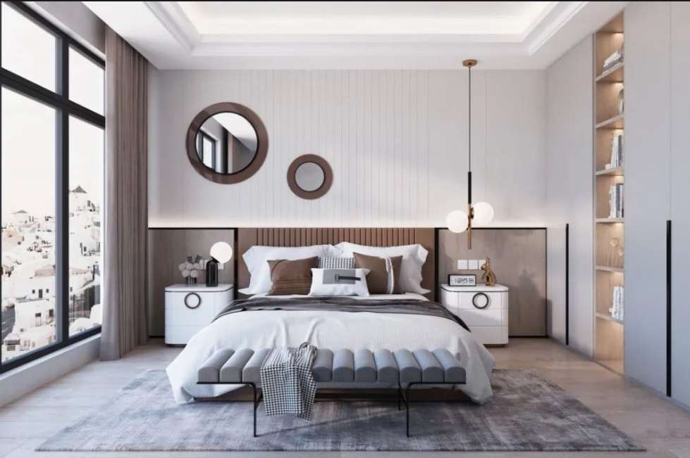 拆除卧室原有隔墙,拓宽空间尺度,引光入室勾勒家的轮廓。口袋移门隐于饰面板隔墙内,赋予书房未来独立成卧的灵活可能。温润木质书桌搭配黑色木饰面,划分功能区的同时,增添空间层次感与韵律感。共享区与多功能书房相互呼应,实现 “各享其趣,抬眸可见” 的理想互动场景。