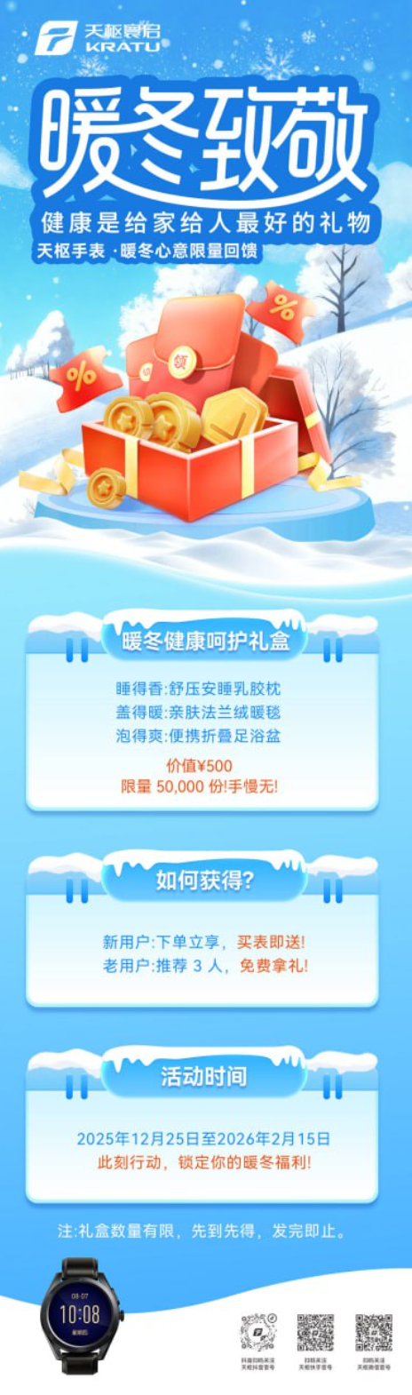 从2025年12月25日至2026年2月15日,横跨圣诞、元旦、春节三大节日,天枢将科技的理性与人文的感性完美融合。用户仅需支付1126元购买天枢预警手表,即可额外获赠一套价值500元的“暖冬健康呵护礼盒”。