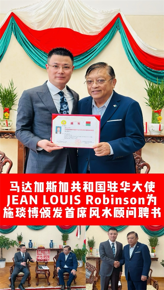 近日,马达加斯加共和国驻华大使馆在北京举行隆重聘任仪式,让·路易·罗班松(JEAN LOUIS Robinson )大使代表马达加斯加共和国正式聘任国际知名易学家、道家文化学者施琰博先生为驻华大使馆首席风水顾问。这一举措不仅彰显了对施琰博先生专业造诣的高度认可,更成为中马两国文化交流向纵深发展的重要见证,为2024年两国建立的全面战略合作伙伴关系注入文化新动能。