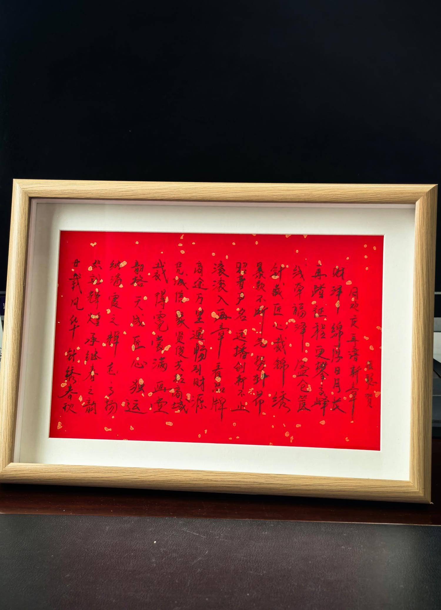 “廿载风华,针绣春秋,织就辉煌。承继春之韵,纳海霞之辉,志高扬……” 苍劲有力的墨迹在相框中静静诉说着韵格的故事。词句中提到的“针藏匠心裁锦绣,线牵福泽盈仓箧”,不仅是对韵格过去成就的点赞,更是对企业未来“财泽绵厚日月长”的美好祈愿。这种书香与墨香的交织,将庆典的仪式感推向了艺术的高度。