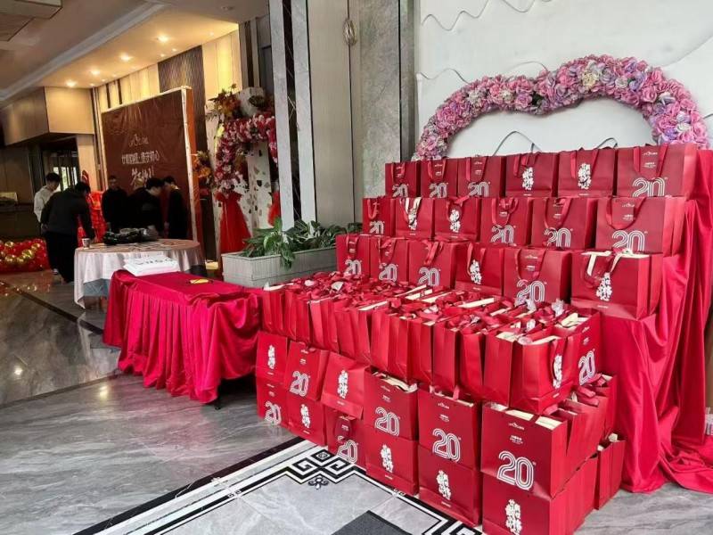 此外,现场的视觉美陈处处彰显匠心。从红金配色的20周年主题签到墙,到排列整齐、充满喜庆氛围的礼品堆头,再到迎宾前台处精心布置的周年装饰,无不体现出韵格作为高端品牌对细节的极致把控 。